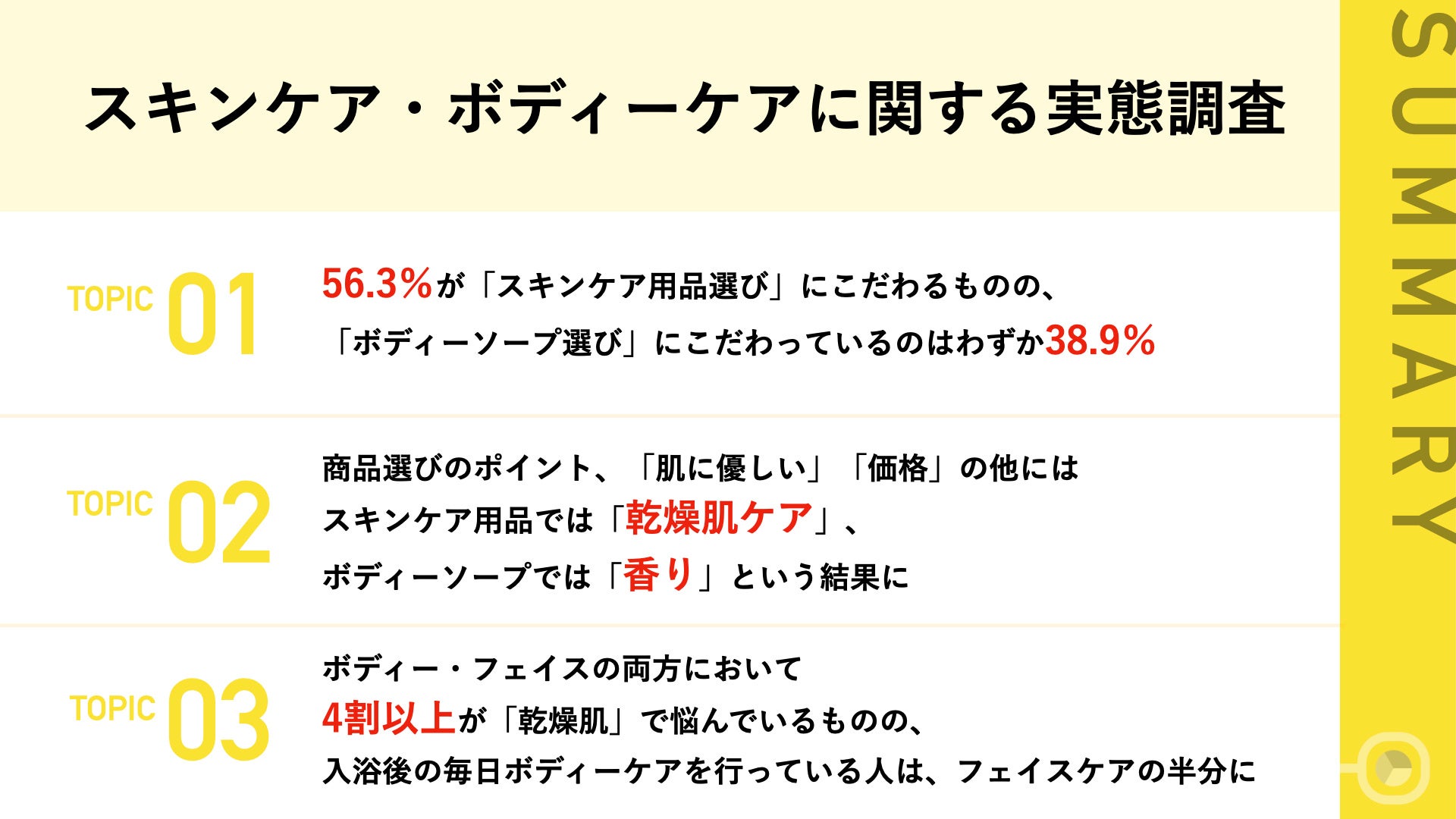 しかし、フェイス・ボディー共通の肌の悩みとして「乾燥肌」が挙げられているように、ボディーも日々の保湿などのケアが大切です。毎日使用するボディーソープなどの洗うケアから見直し、好みやお悩みに合わせたアイテムを選んでみてはいかがでしょうか。