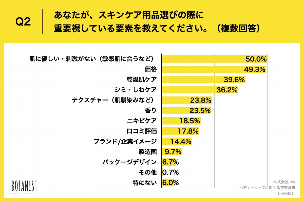 Q1で「自分で選んでいない/使用していない」以外を回答した方に、「Q2.あなたが、スキンケア用品選びの際に重要視している要素を教えてください。(複数回答)」(n=298)と質問したところ、「肌に優しい・刺激がない(敏感肌に合うなど)」が50.0%、「価格」が49.3%、「乾燥肌ケア」が39.6%という回答となりました。