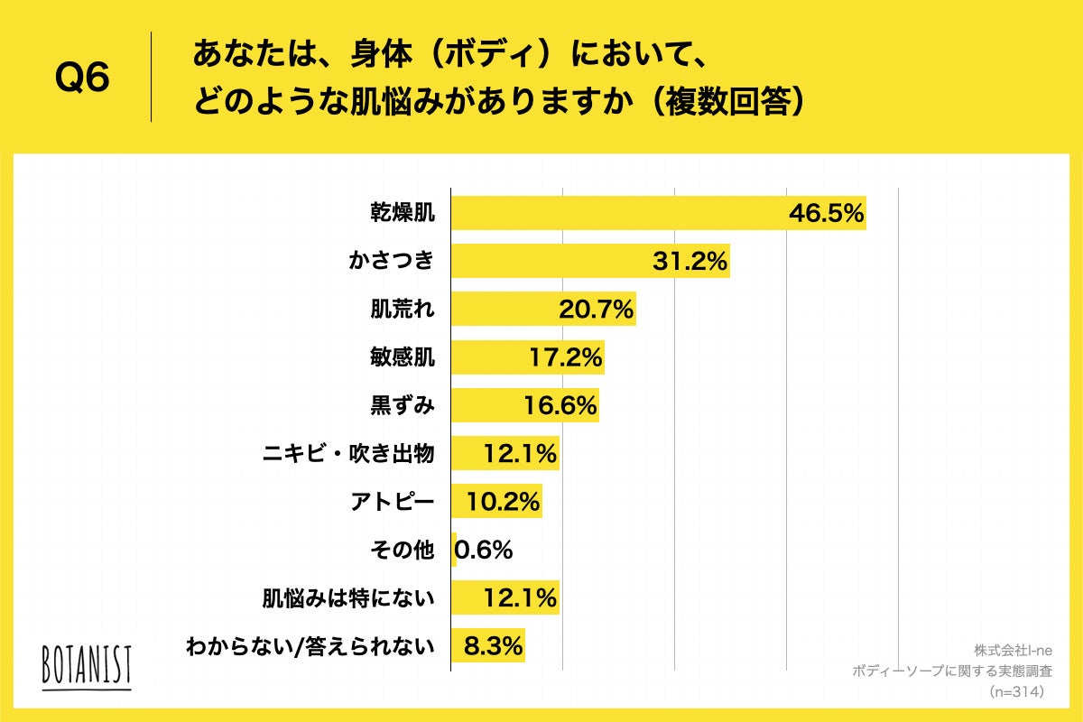 「Q6.あなたは、身体(ボディー)において、どのような肌悩みがありますか(複数回答)」(n=314)と質問したところ、「乾燥肌」が46.5%、「かさつき」が31.2%、「肌荒れ」が20.7%という回答となりました。