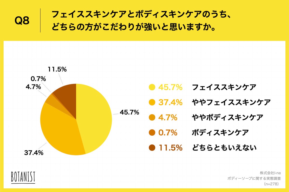 Q1で「自分で選んでいない/使用していない」以外を回答した方に、「Q8.フェイススキンケアとボディースキンケアのうち、どちらの方がこだわりが強いと思いますか。」(n=278)と質問したところ、フェイススキンケアは、「フェイススキンケア」が45.7%、「ややフェイススキンケア」が37.4%という回答となりました。