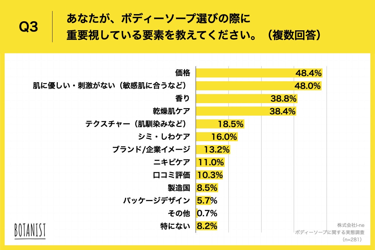 Q1で「自分で選んでいない/使用していない」以外を回答した方に、「Q3.あなたが、ボディーソープ選びの際に重要視している要素を教えてください。(複数回答)」(n=281)と質問したところ、「価格」が48.4%、「肌に優しい・刺激がない(敏感肌に合うなど)」が48.0%、「香り」が38.8%という回答となりました。