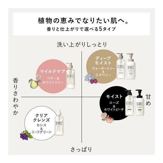 なりたい肌に合わせて選べる6種のボディソープをラインナップ。