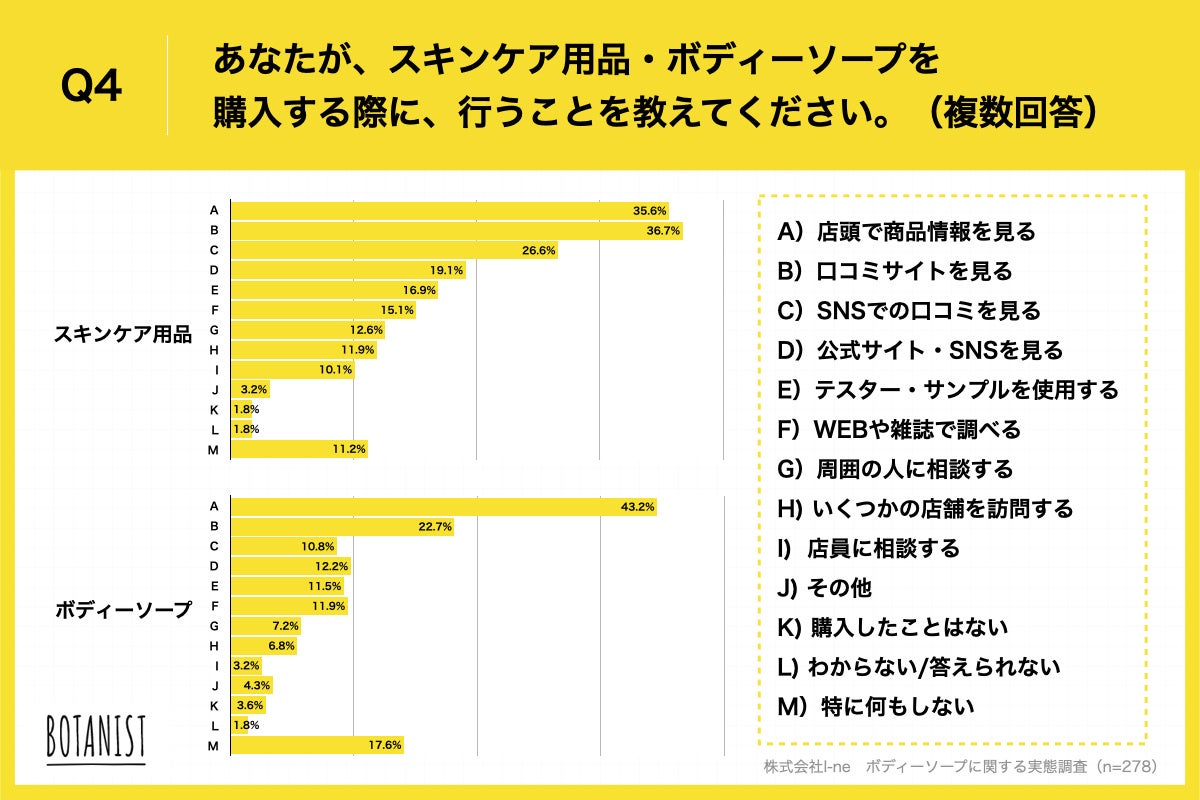 Q1で「自分で選んでいない/使用していない」以外を回答した方に、「Q4.あなたが、スキンケア用品・ボディーソープを購入する際に、行うことを教えてください。(複数回答)」(n=278)と質問したところ、スキンケア用品は、「店頭で商品情報を見る」が35.6%、「口コミサイトを見る」が36.7%、「SNSでの口コミを見る」が26.6%、ボディーソープは、「店頭で商品情報を見る」が43.2%、「口コミサイトを見る」が22.7%、「SNSでの口コミを見る」が10.8%という回答となりました。