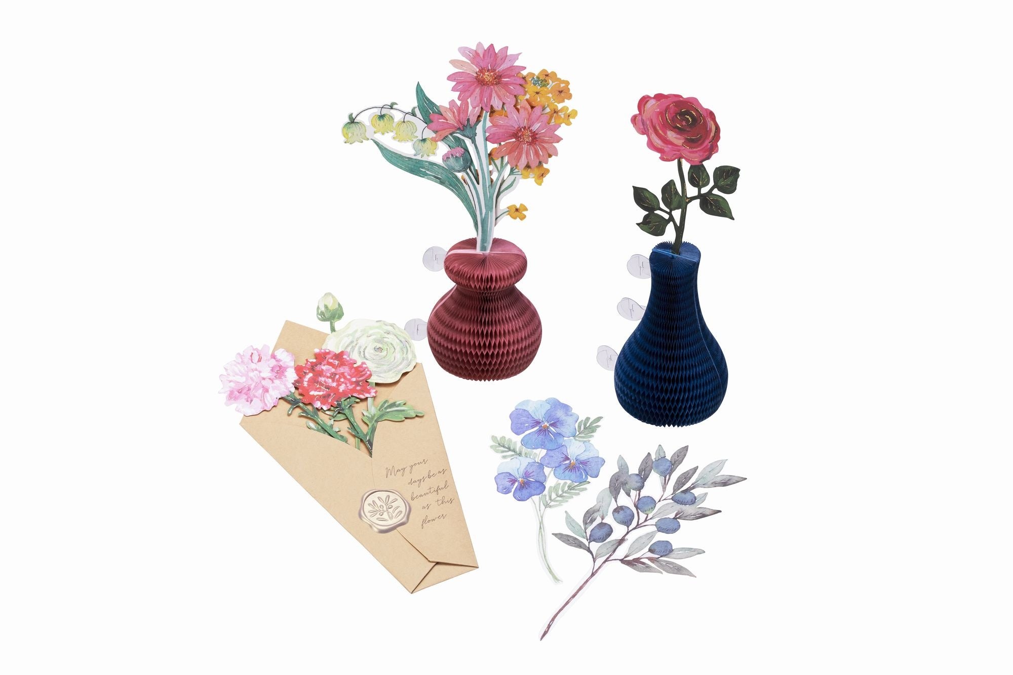 28種類のダイカットフラワーは、ギフトに添えたりハニカムベースにに立てて飾れたりするほか、