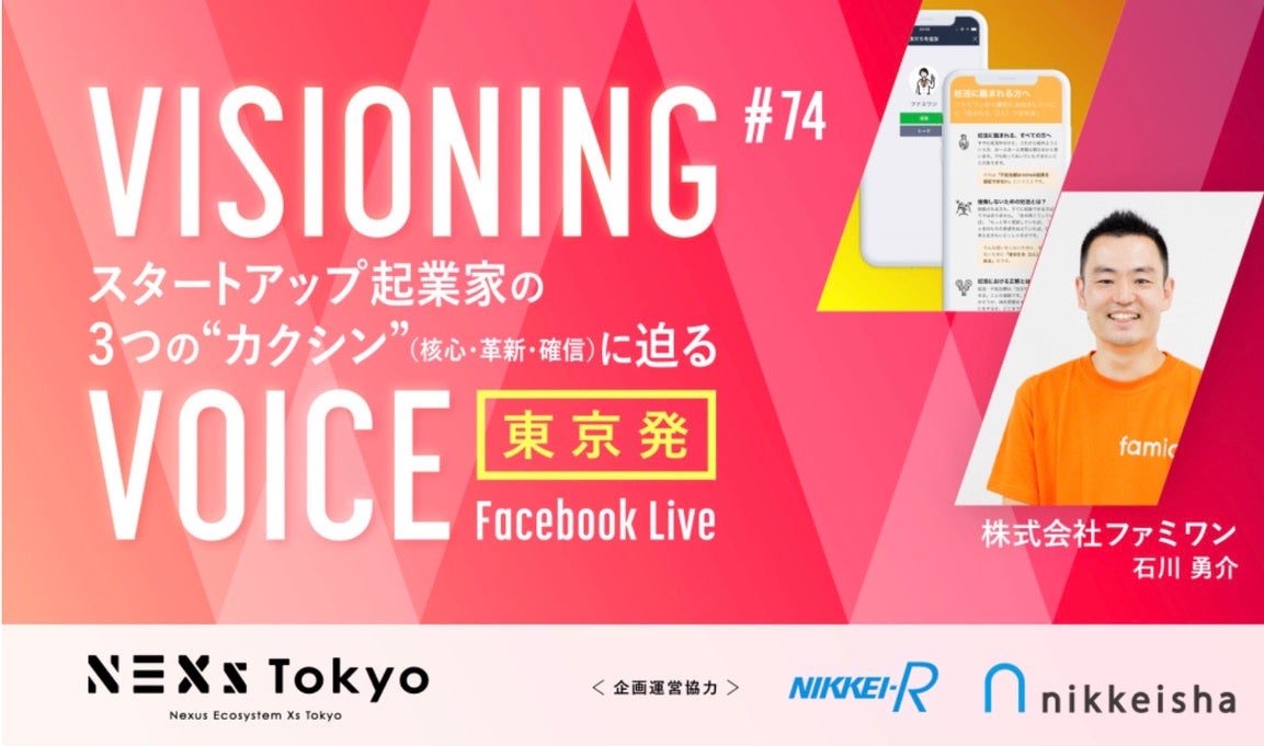 「子どもを願うすべての人によりそい 幸せな人生を歩める社会をつくる」をビジョンに掲げ、LINEを活用した妊活コンシェルジュサービス「famione(ファミワン)」 https://lp.famione.com/ を提供する株式会社ファミワン(本社:東京都渋谷区、代表取締役:石川勇介、以下当社)の代表石川は4月26日、東京都が実施するプログラム「NEXs Tokyo(Nexus Ecosystem Xs Tokyo)」と日経グループが連携して提供するインタビュー番組「VISIONING VOICE」にゲスト出演します。