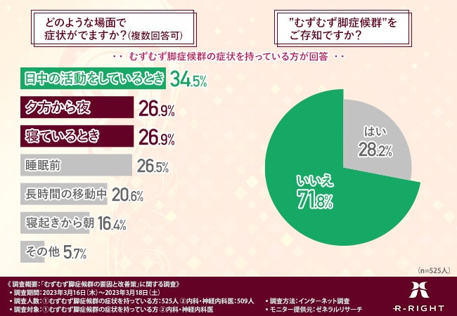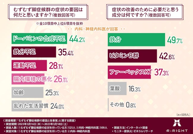 そこで今回、サプリメントの『むずむずクリア』(https://muzumuzuclear.com/lp?u=a)を販売している株式会社アールライトは、①むずむず脚症候群の症状を持っている方、②内科・神経内科医を対象に、「むずむず脚症候群の要因と改善策」に関する調査を実施しました。