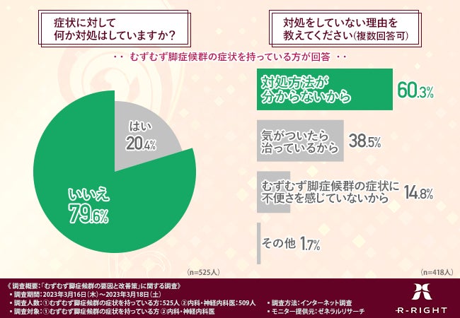 先程の質問で『いいえ』と回答した方に、「対処をしていない理由を教えてください(複数回答可)」と質問したところ、『対処方法が分からないから(60.3%)』と回答した方が最も多く、次いで『気がついたら治っているから(38.5%)』『むずむず脚症候群の症状に不便さを感じていないから(14.8%)』と続きました。