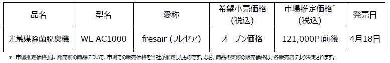 その一環として今回当社は、昨今の衛生的な環境の確保が求められる状況下において、室内空気の浄化に対する意識の高まりから、家庭内の空気環境改善に向けて、光触媒除菌脱臭機“fresair(フレセア)”「WL-AC1000」を発売します。