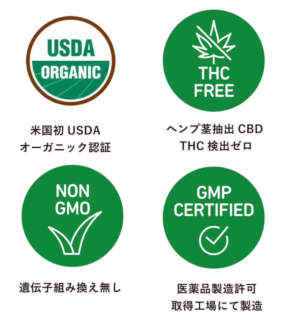使用しているCBD原料は、各種認証を取得の上、日本の法規則をクリアしている原料です。USDAオーガニック認証を取得したヘンプ由来の質の高いCBDオイルを使用しているため、安心してお使いいただけます。