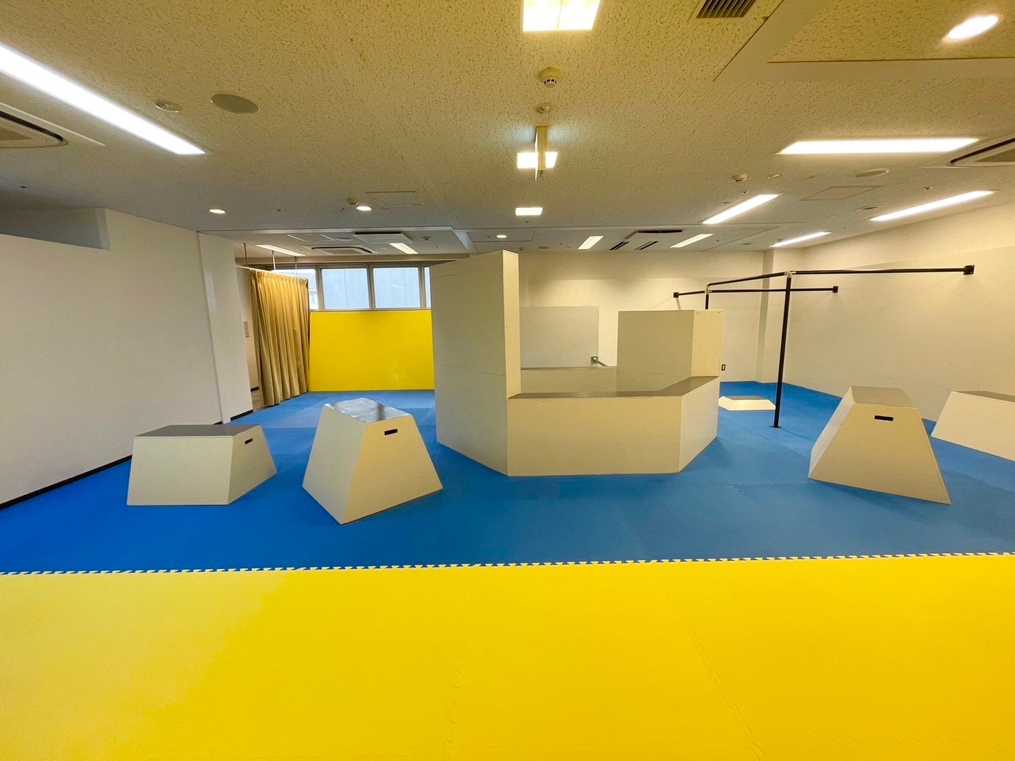 約40坪の広さのパルクールエリアには6歳〜12歳を対象に設計されたウォールやボックスなどの障害物を配置。