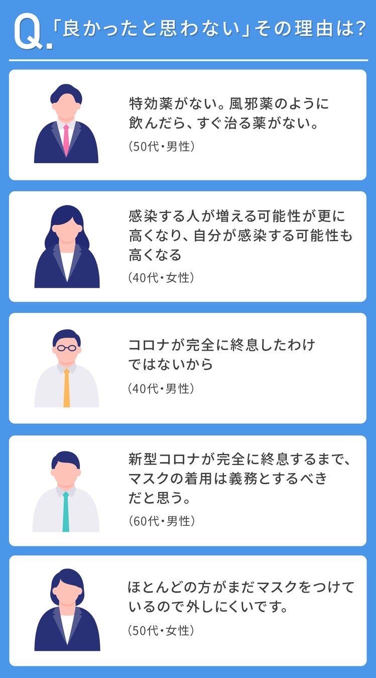 「暑くなるから外したい」といった意見が多くあった一方で、「マスクが感染症対策として有効だったか怪しい」といった意見も見られました。