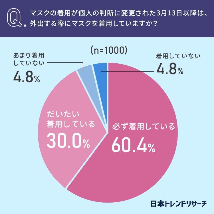さらに、マスクの着用が個人の判断に変更された3月13日以降は、外出する際にマスクを着用しているかを聞いてみました。