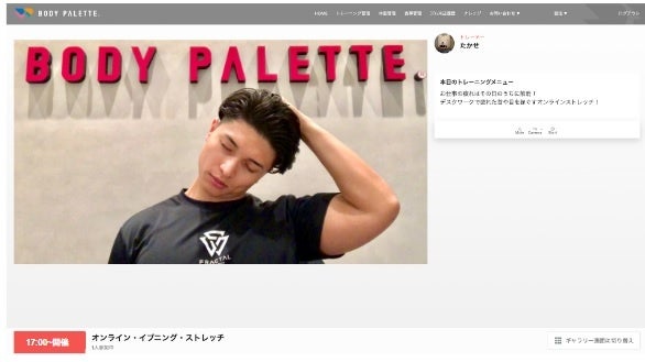 ボディパレットのメインメニューは、企業単位で実施する週1回の全社員参加のオンラインエクササイズ「ボディパレットオンライン」です。