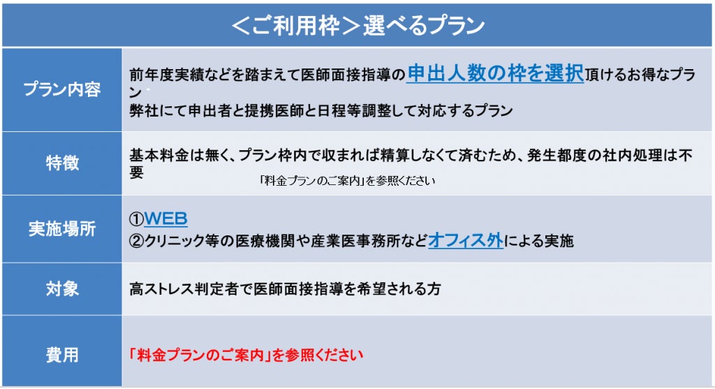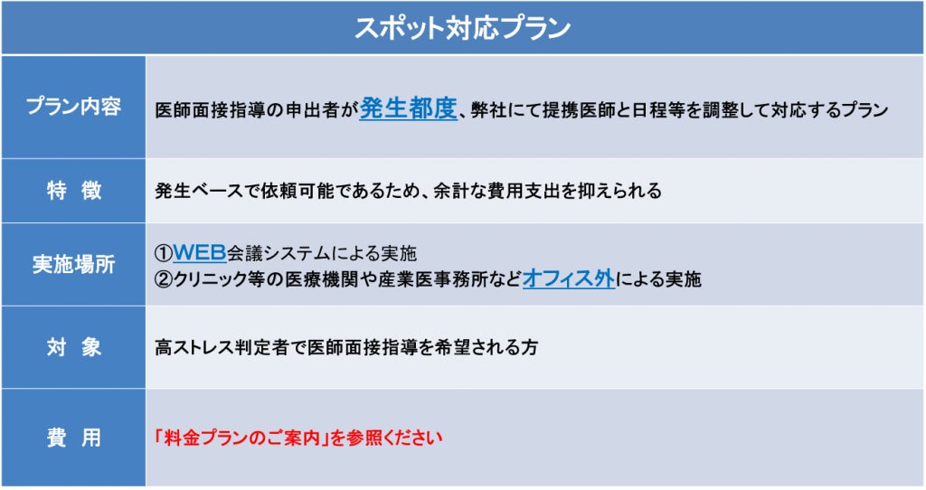 その名の通り、医師面接指導の申出があった都度、ご依頼を頂くプランです。発生ベースでのご依頼となりますので、基本料金はありますが、余計な支出を抑えられるプランとなっています。