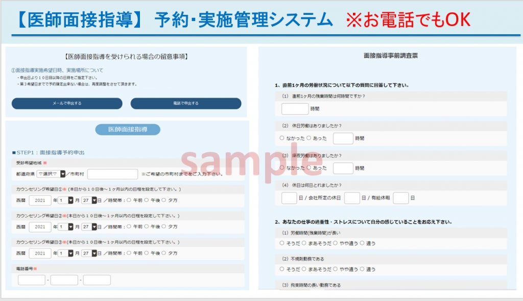 従業員との日程調整・事前問診対応は電話受付・メール案内の他、医師面接指導の申出・管理システム上にて受付けることが可能です。