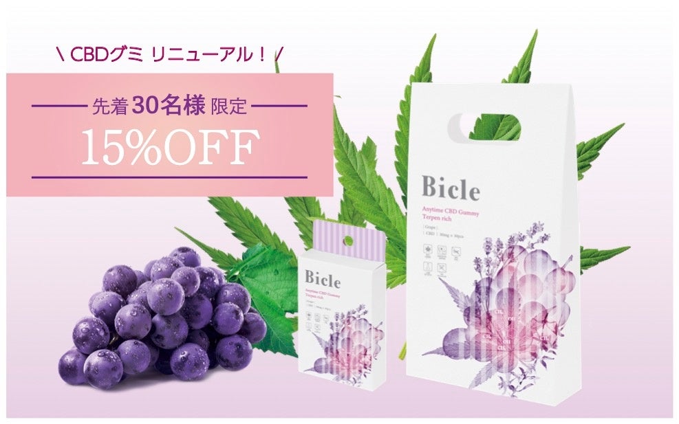 BicleエニタイムCBDグミのリニューアルにあたり、いつもご愛顧いただいているお客様へ先着30名様限定で、『定価の15%OFF』の特別価格にてお買い求めいただけます。