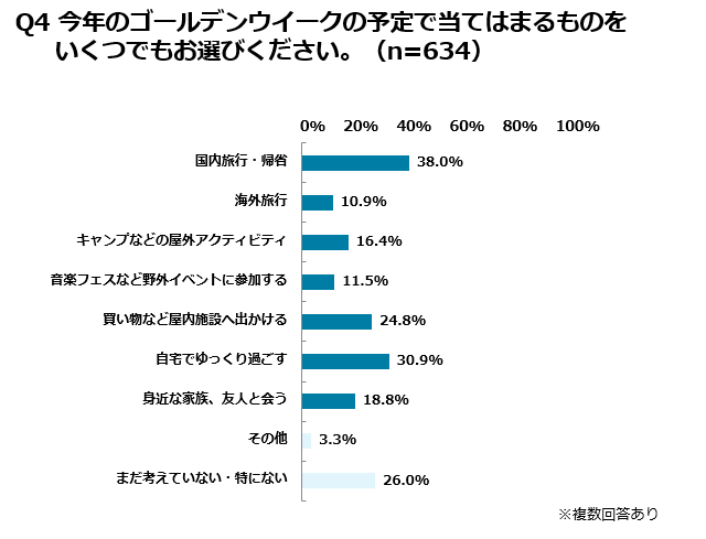 「ゴールデンウイークの予定」については1位「国内旅行・帰省」、2位「自宅でゆっくり過ごす」という結果となりました。3位以下で「屋内施設へ出かける」「身近な家族、友人と会う」など外出する予定が多いことがわかり、「海外旅行」などが伸び悩んだことから今年のゴールデンウイークは近場で出かける予定を立てている傾向が見えました。