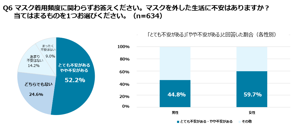 ◇「日常生活においてマスクを外すことが増えた」と回答した方は38.0%。「マスクを外した生活に不安を感じる」という方は全体で52.2%、男女別では、男性で44.8%、女性で59.7%とやや女性で不安度が高いことが判明。