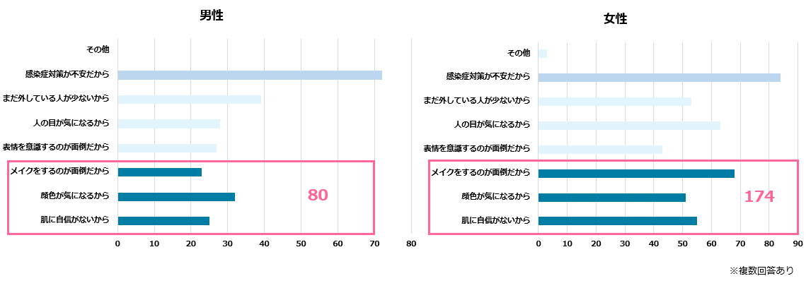「感染症対策が不安だから」がTOPでした。またそれ以外の理由を確認すると、女性においては「肌に自信がないから」「顔色が気になるから」「メイクをするのが面倒だから」というマスクがあるからこそ隠すことができていた“見た目”に関する不安をもっている方が多いこともわかりました。