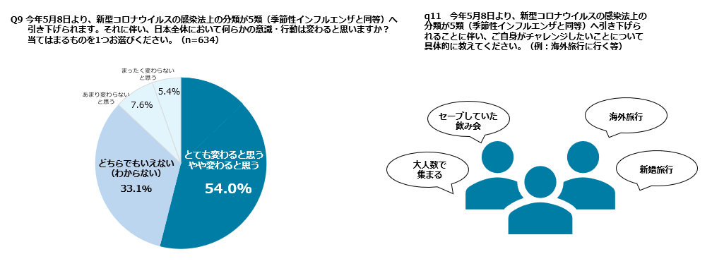 感染症分類が5月8日から変更となり、新型コロナウイルスがインフルエンザなどと同等の5類へ引き下げとなります。それに伴い「何らかの意識・行動は変わると思いますか」という問いに「とても変わると思う」「やや変わると思う」と回答した方は54%と半数を超えました。中でも、コロナ禍でセーブされていた「海外旅行」など大きな移動を伴う活動や、身近な方と会う機会として「飲み会」「大人数で集まる」などへ挑戦したいという声もみられました。