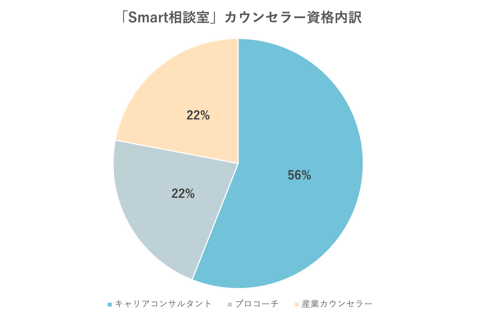 Smart相談室がサービスを開始した当初、カウンセラー数は4名でした。今では150名を越えるカウンセラーの方にご参加いただき、日々、相談者様の声に応えています。「Smart相談室」は、何を相談しても良いサービスです。相談者様がカウンセラーを選び、何回でもご相談いただけます。結果として相談者様は、より多くのカウンセラーの中からご自分が良いと思うカウンセラーを選べることも魅力の一つです。そんなニーズに対応すべく、様々な背景をお持ちのカウンセラーの皆様にご協力をいただいており、全員が対人支援に関する有資格者の方です。今回、その1つの項目として当該資格保有者の割合を集計いたしました。(*1)