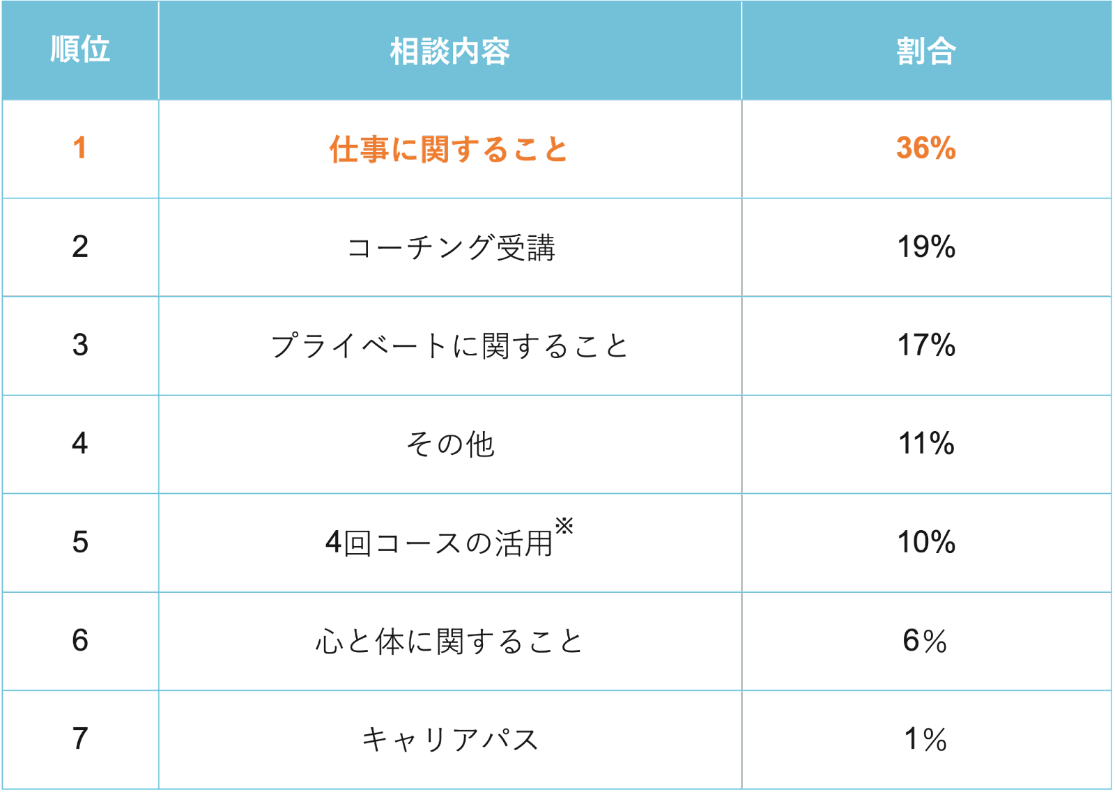 2023年3月の相談内容は、1位「仕事に関すること」36%、2位「コーチング受講」19%、3位「プライベートに関すること」17%