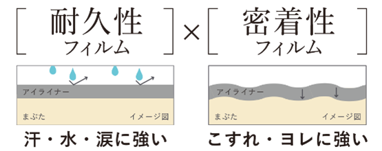 汗・水・涙に強い耐水性フィルムと、こすれ・ヨレに強い密着性フィルムで、