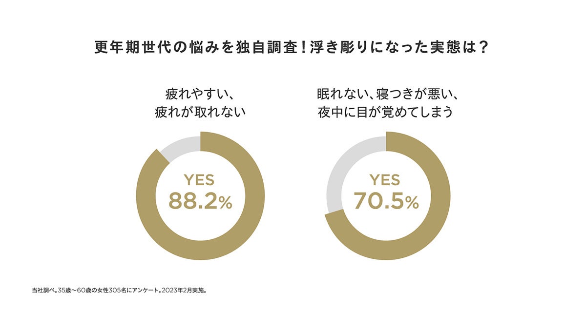 「『疲れやすい・疲れがとれない』と答えた人は実に88.2%。そして、『眠れない・寝つきが悪い・夜中に目が覚めてしまう』と答えた人は70.5%。多くの更年期世代の方が今までにない変化や不調を感じているという結果が現れました。睡眠の悩みや、疲れが取れないなどの疲労感、やはりこれも更年期世代によくある症状の一つなのでしょうか。」