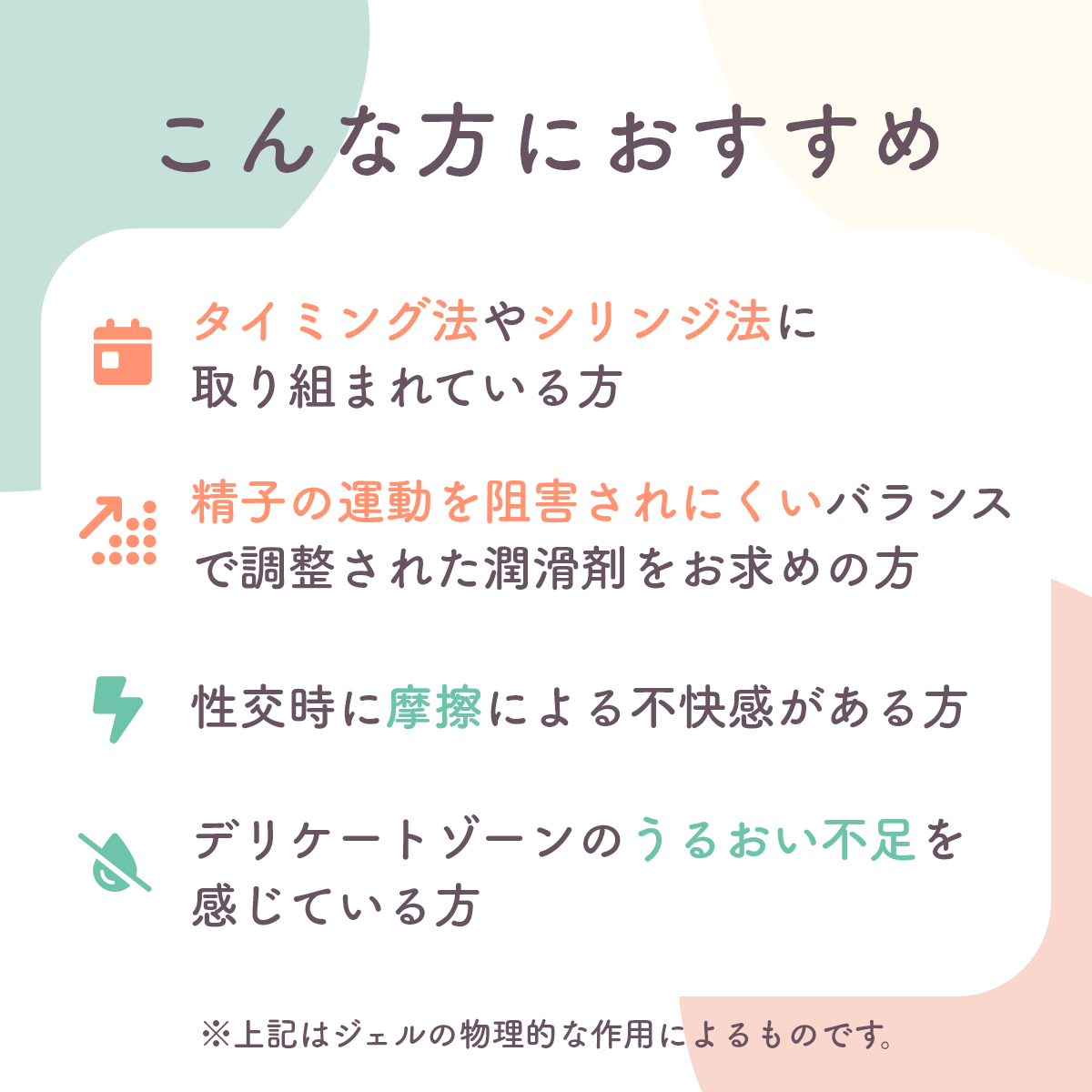 通常の潤滑ジェルに比べ、精子の活動を妨げない粘度に調整し、妊活中でも安心して使用できるように開発いたしました。
