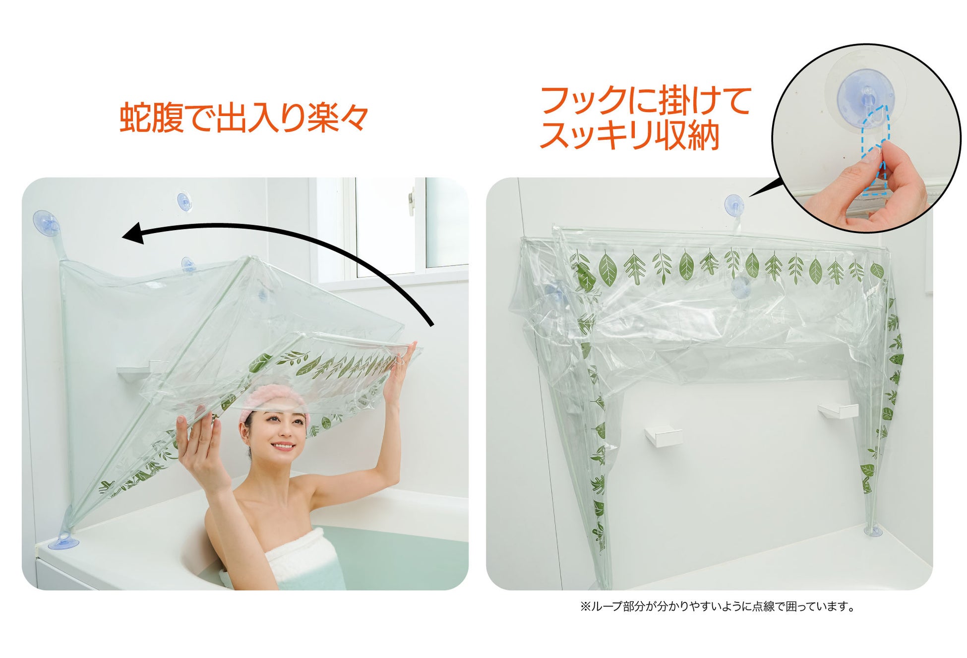 約1分で設置可能!本品を広げ、6つの吸盤をお風呂の壁と浴槽に貼り付けるだけでOK!そのままお湯張りも出来ます。蛇腹構造でパタパタっと開いて出入りも簡単♪使用後も折りたたんで専用フックに引っかけるだけでスッキリ収納で片付け不要です。