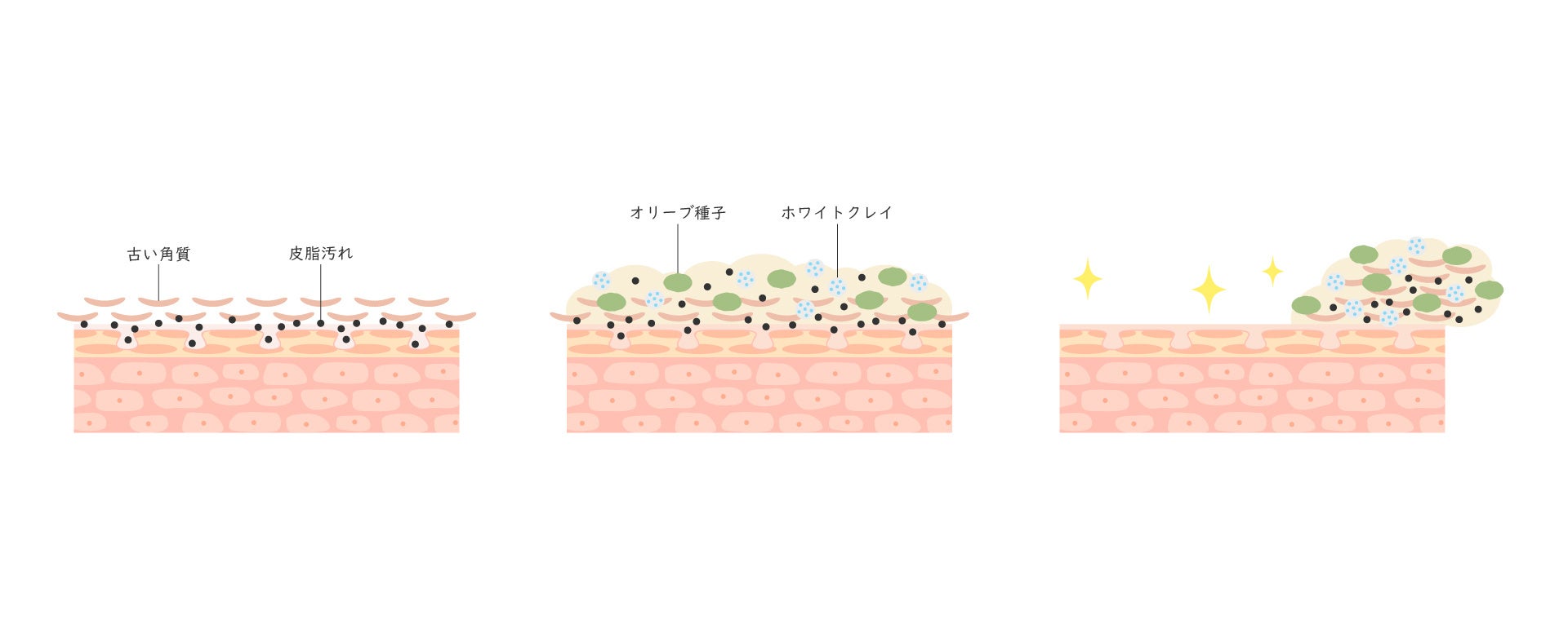 古い角質がたまりがちな肌表面をホワイトクレイ*1とオリーブ種子の天然スクラブでやさしく磨き、