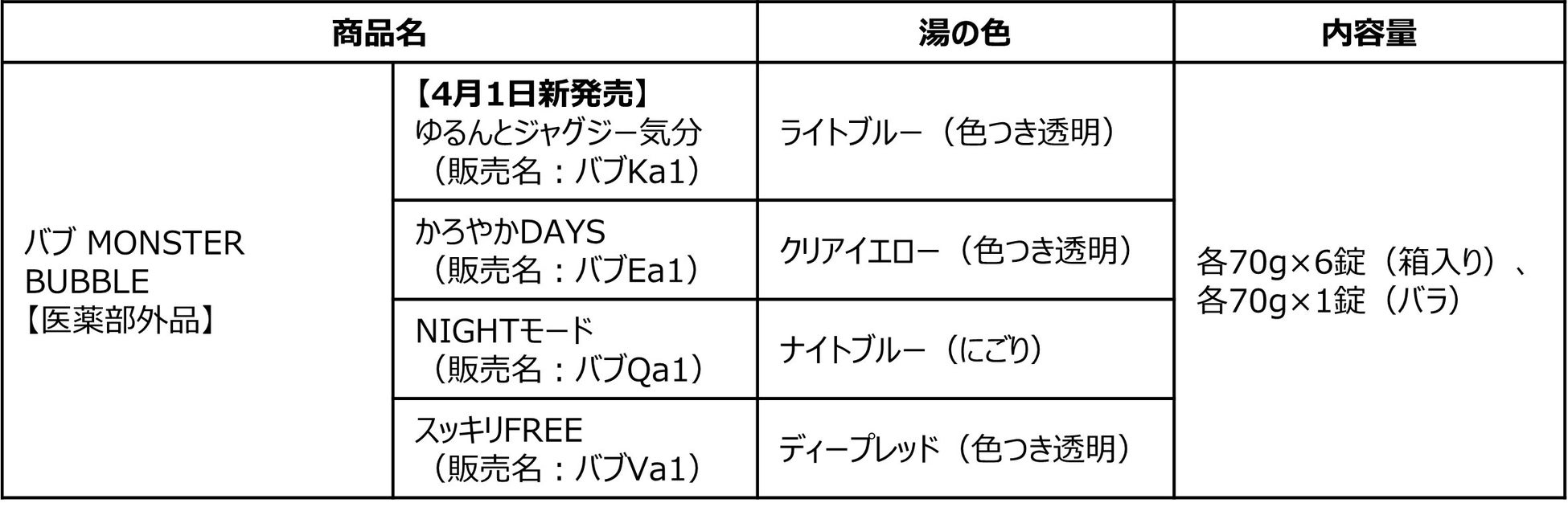 2022年10月に発売した『バブ MONSTER BUBBLE』は、ぬるめのお湯でも入浴効果を高めて、春夏でも長く心地よくオフロを楽しめる「ゆるんとジャグジー気分」を4月1日(土)に新発売。オフロ時間の過ごし方に合わせて選べるアイテムと、オフロをもっと面白くする(※2)入浴アイデアで、楽しいバスタイムをご提案しています。
