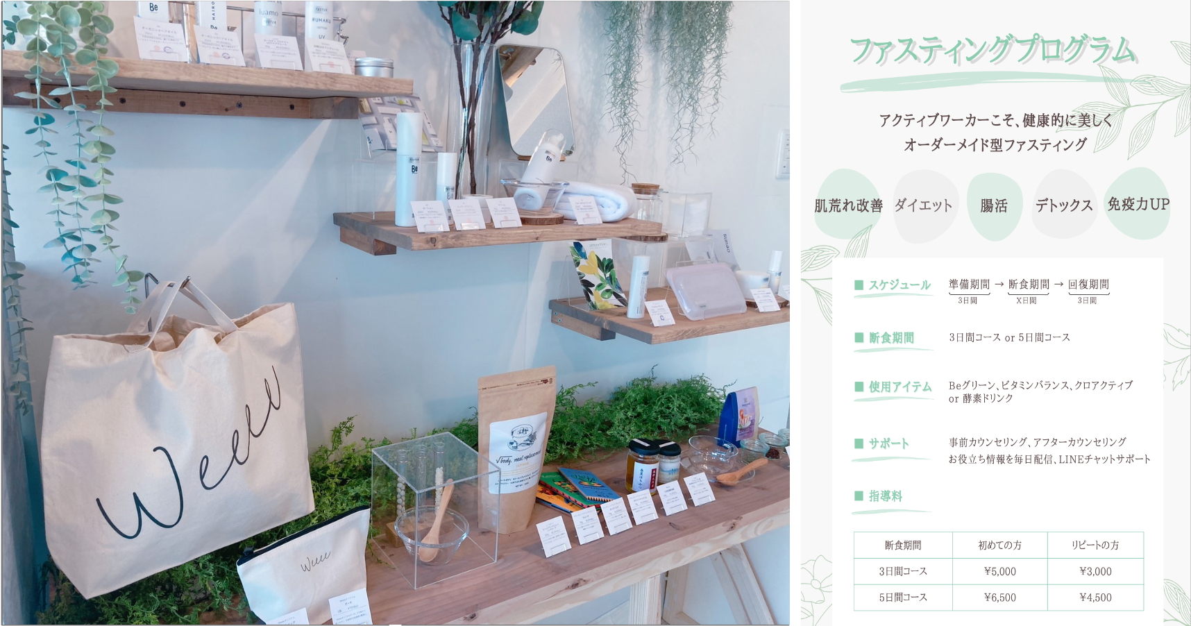 オーダーメイドのファスティングプログラムも実施しており、肌荒れ改善・ダイエット・腸活・デトックス・免疫力UPが期待できます。