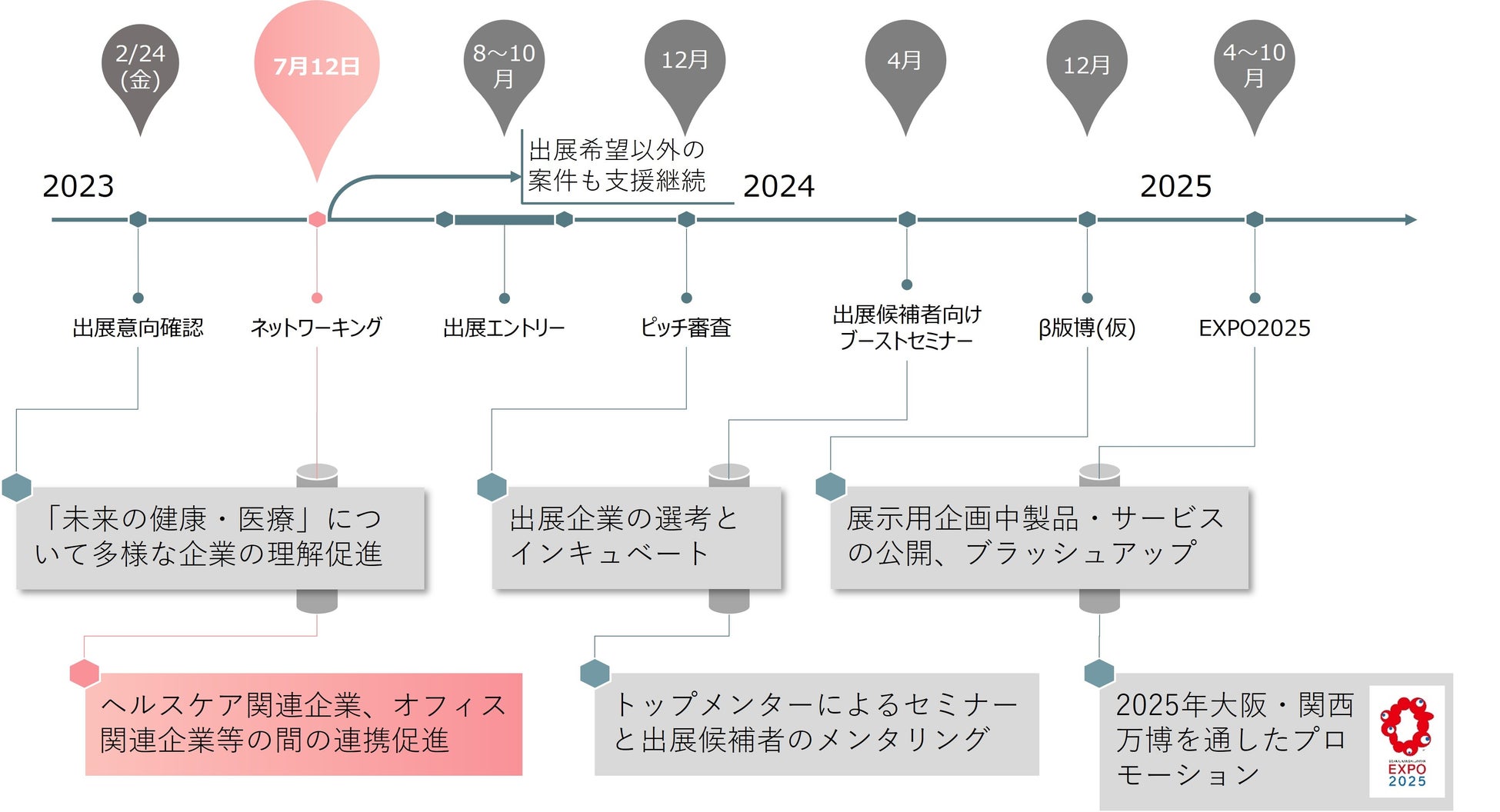 本ネットワーキングは、2025年・大阪関西万博の大阪ヘルスケアパビリオンへの展示出展に向けた一連の取り組みの一つでもあります。展示出展エントリーを希望する場合、下記Webサイトをご確認の上、現在受付中の一次エントリーに続けて、8/17(木)以降に行う「出展エントリー」へと進んでください。