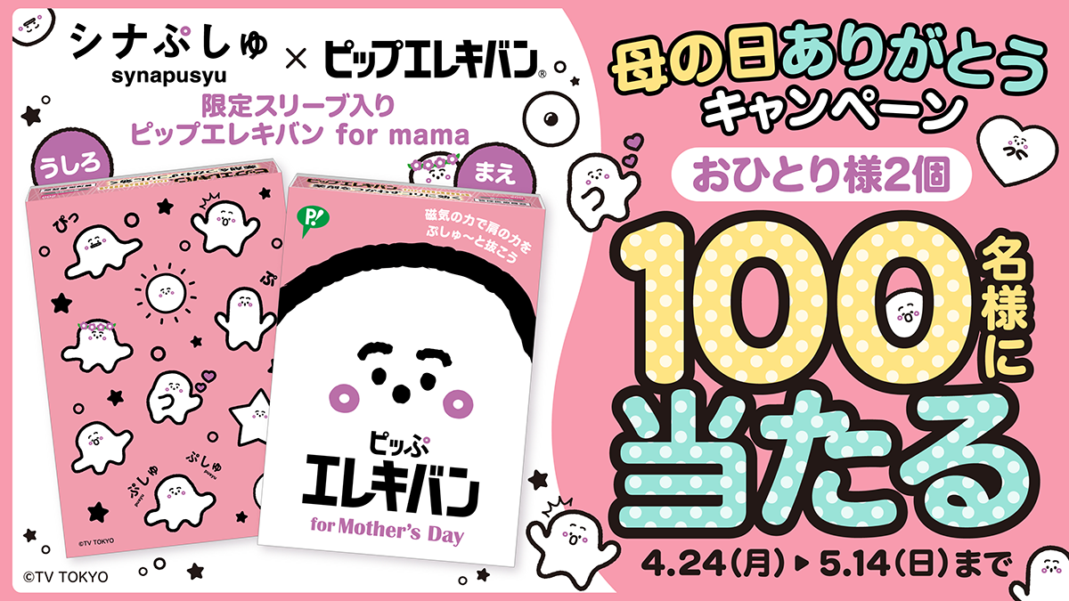 赤ちゃんの世界が「ぷしゅっ」と広がり、赤ちゃんを育てるすべての人の肩の力が「ぷしゅ~」と抜ける番組とし て、テレビ東京系列6局ネットにて平日あさ7:30から放送中の人気番組「シナぷしゅ」と、磁気の力で血行を改善しコ リをほぐす「ピップエレキバン」のコラボレーションが実現しました。『「母の日』に日々の感謝を込め、肩の力を抜いて癒されて欲しい」という想いでお届けするコラボキャンペーンです。