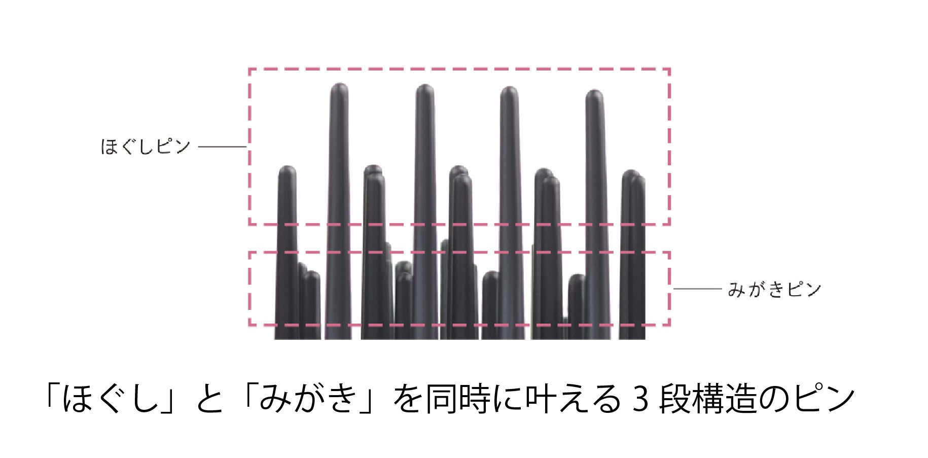 1.ほぐしピンとみがきピンによる三段構造で、瞬間、さらツヤを実現。