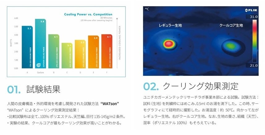 アメリカで特殊な技術により開発された冷感をもたらす素材です。同じクーリング機能でも、接触冷感は熱伝導性が高いため、接触した部分を冷たく感じるのは最初に触れた一瞬だけです。一方、このクールコアは気化熱を利用して冷却するので、水分がある限りクーリング効果が持続されるのが特徴です。