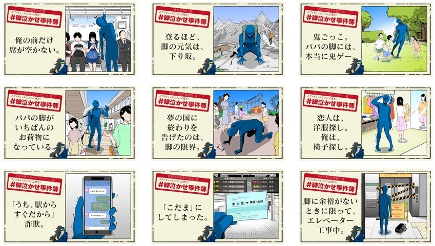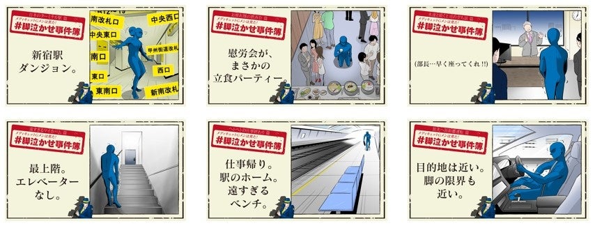 #脚泣かせ事件簿 は、悲鳴を上げる男性の脚にまつわる“あるある”をまとめたコンテンツです。電車での通勤中や帰宅中、立っている時に感じる、「俺の前だけ席が空かない。」や、買い物中に陥る、「恋人は、洋服探し。俺は、椅子探し。」、さらに「慰労会が、まさかの立食パーティー。」というがっかりする不意打ちなど、生活に潜む15のあるあるを、思わず共感してしまうようなコピーとイラストで表現しています。こうした様々な事件簿を通して、日常に多くの脚泣かせなシーンが存在していることを伝えます。