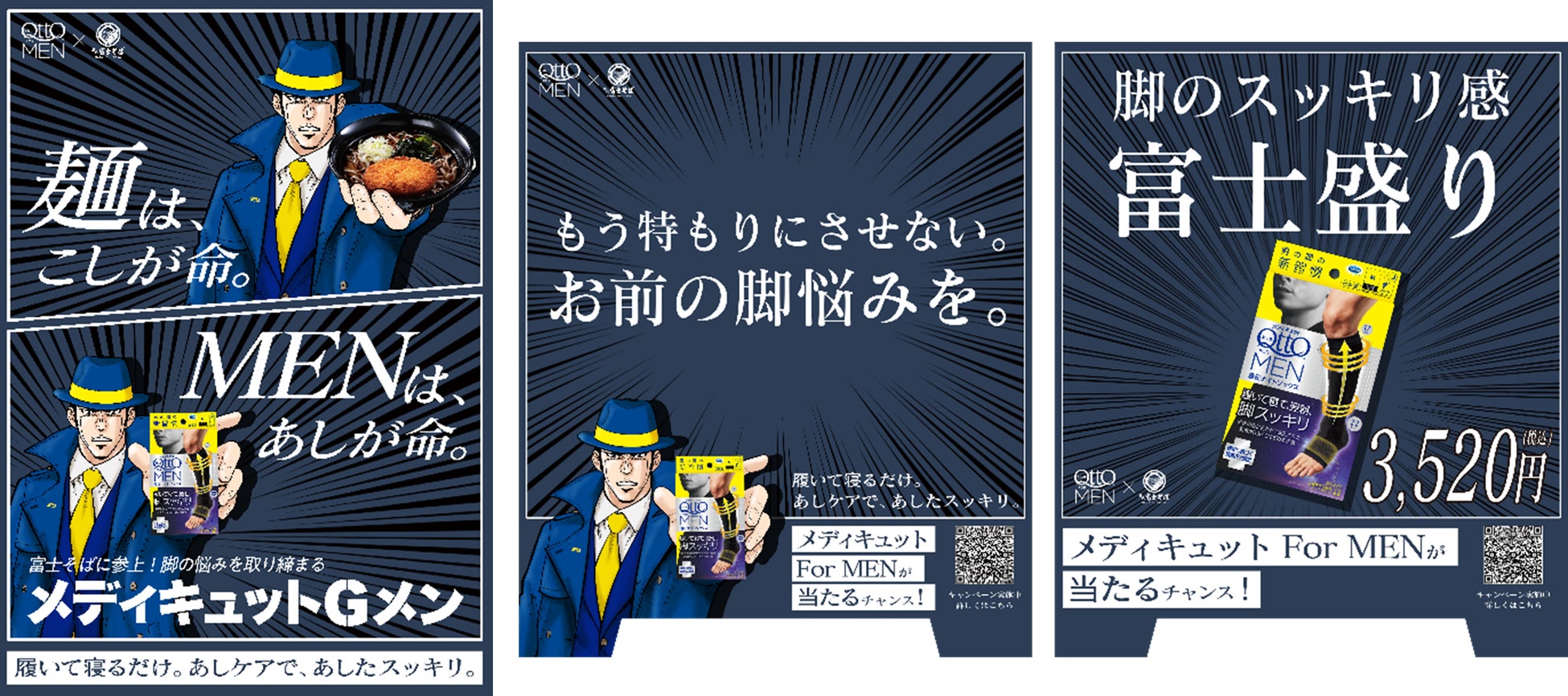 今回は、「名代 富士そば」の中でも立ち食い形態を中心にそばを提供している、赤坂見附店、飯田橋駅前店、浜松町店の都内3店舗とコラボ。店内では、メディキュットGメンが「もう特もりにさせない。お前の脚悩みを。」、「脚のスッキリ感富士盛り」という立ち食いそば屋特有の「#脚泣かせ事件簿」を紹介することで、立ち食いそば屋でも酷使されている男性の脚の実状を明らかにし、ケアの必要性を訴えます。なお、ポスター内のQRコードを読み込んでいただくと、開催中のTwitterキャンペーンの画面に遷移し、キャンペーンに参加できる仕組みとなっています。