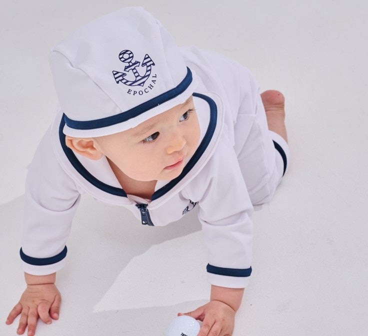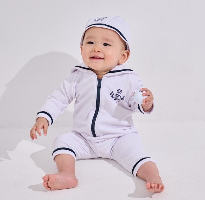 マリンスイムウエア&キャップはいかりマークをあしらった、ホワイト×ネイビーのマリンテイストが爽やかなパンツスーツタイプのラッシュガードとキャップのセット。抱っこしても、ハイハイしても、着崩れることなく0歳のおすわり時期から3歳くらいまで長くご着用いただけます。