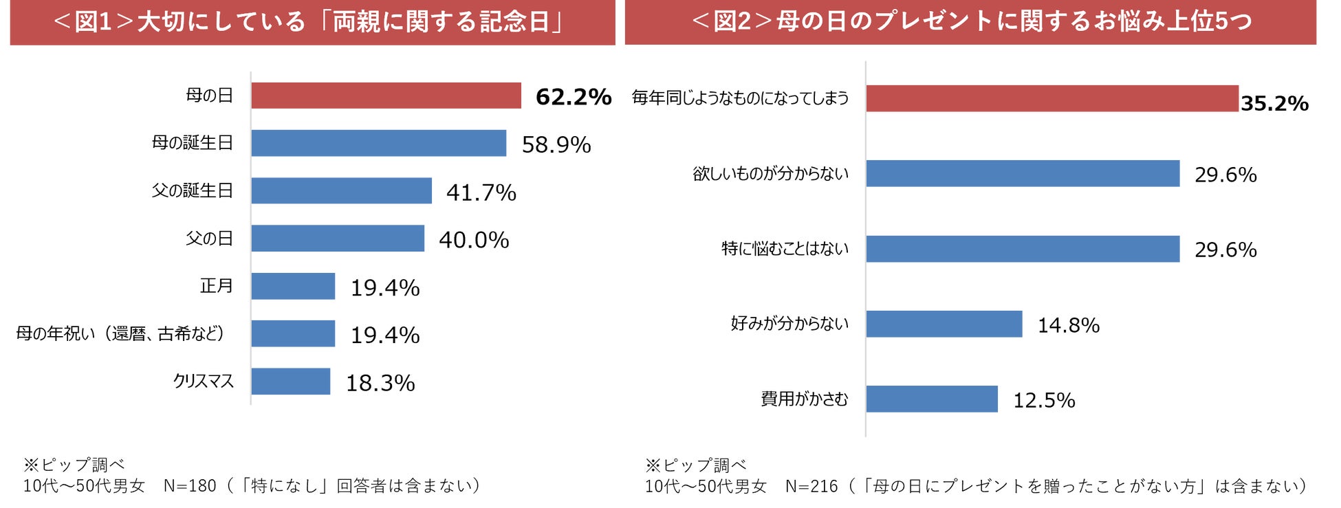 日頃からお世話になっているお母さんへ感謝を伝える母の日。ピップの調査では、大切にしている「両親に関する記念日」として、母の日を大切にしていると答えた方は62.2%いることが判明しました<図1>。そんな中で、毎年選ぶ母の日プレゼントにレパートリーが尽き、悩んでいると回答した方は35.2%に上っています<図2>。その他、欲しいものや好みがわからないという方も多く、プレゼント選びに頭を悩ませていることがわかりました。