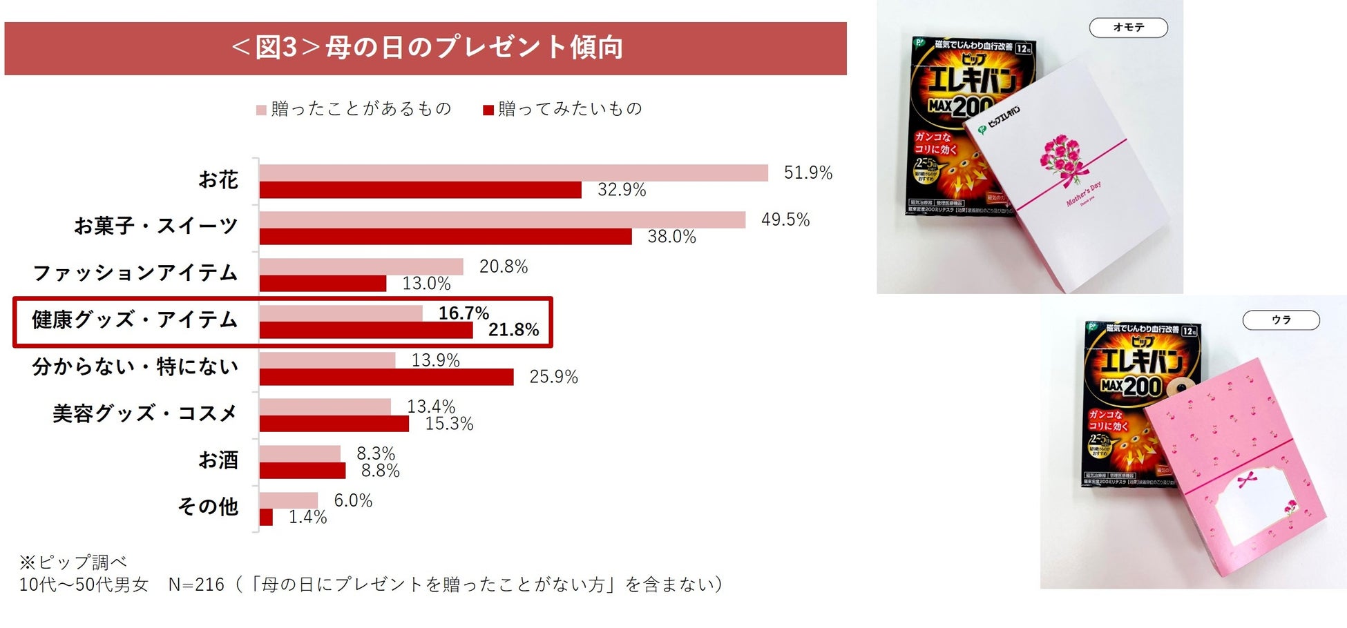 母の日のプレゼントは、多くの方がお花やお菓子、スイーツを選んでいる傾向がある中で、実は健康のためのアイテムを贈ってみたいと考えている人も一定数いることがわかりました<図3> 。毎日忙しく頑張っているお母さんに健康アイテムのプレゼントを贈ることで、感謝の気持ちと身体を労わる想いが伝わります。
