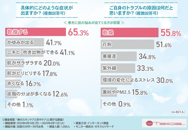 春先の肌トラブルについて調査したところ、乾燥を感じている方が6割以上にも上り、背中のトラブルを感じる方は3割近くいることが分かりました。