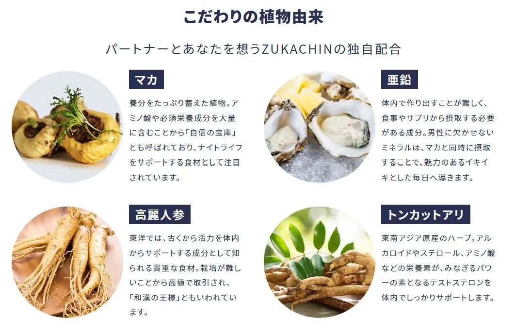 ZUKACHIN(ズッカチン)は、依存性の高い動物性の成分でなく、普段食べられている植物由来の成分を中心に使用しているため、活力剤特有のニオイも気になりません。男性の身体を労わることはもちろん、パートナーである女性のことも考えた活力サプリです。