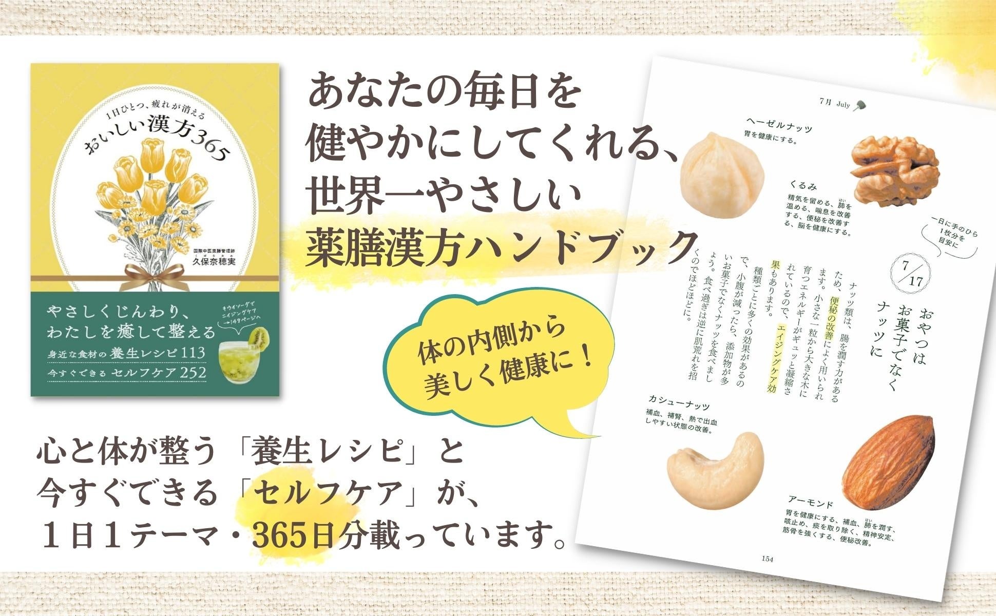 本書では、1日1テーマ・365日、やさしい文章と分かりやすいイラストで、あなたの毎日に寄り添う漢方アドバイスをお届けします。忙しい毎日でも、漢方の知識がなくても、大丈夫。身近な食材でカンタンに作れる「養生レシピ」113点、今すぐ実践できる「セルフケア」のアイデア252点、1日ひとつ読むだけで、季節ごとの不調が整っていきますよ。