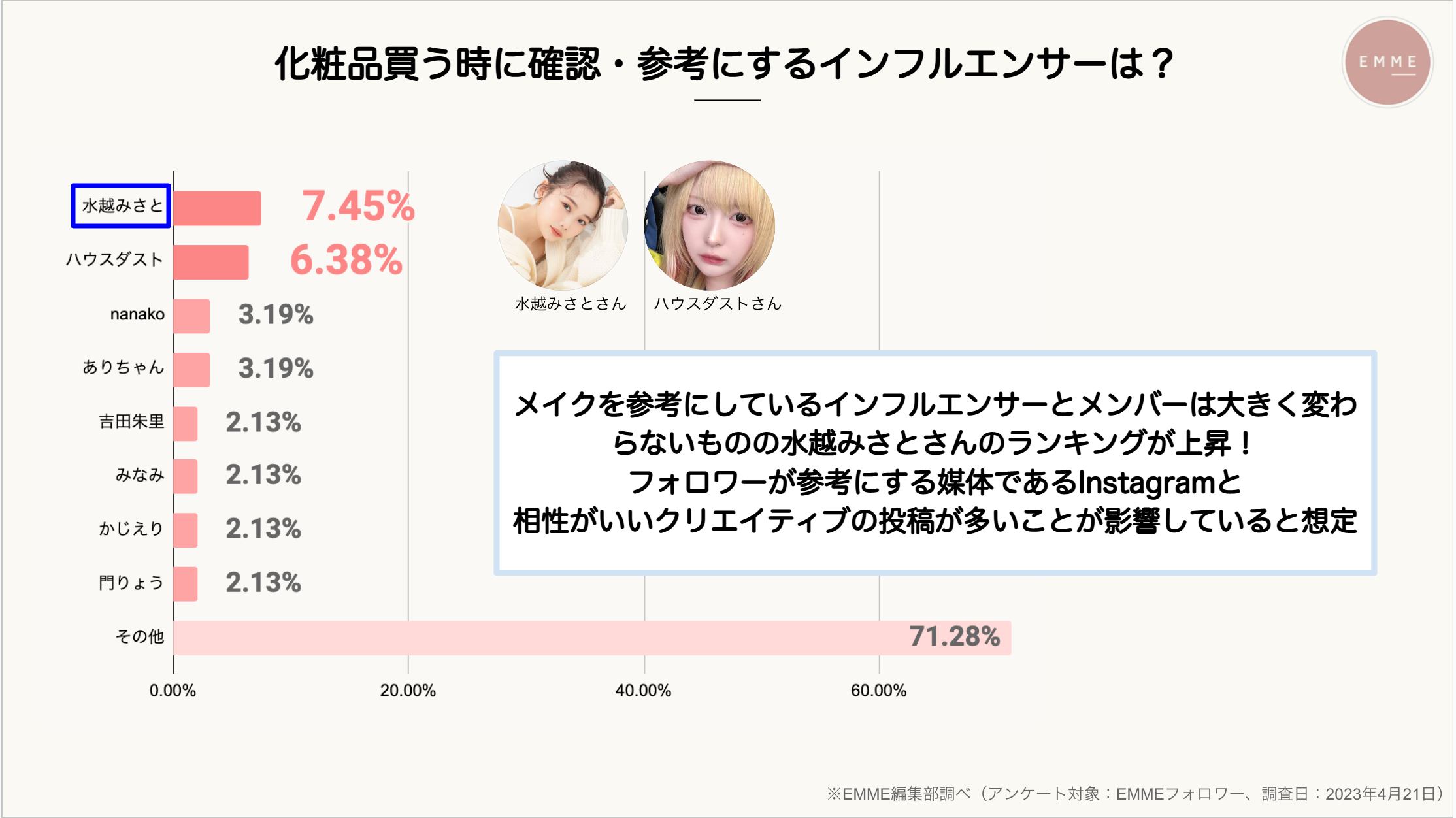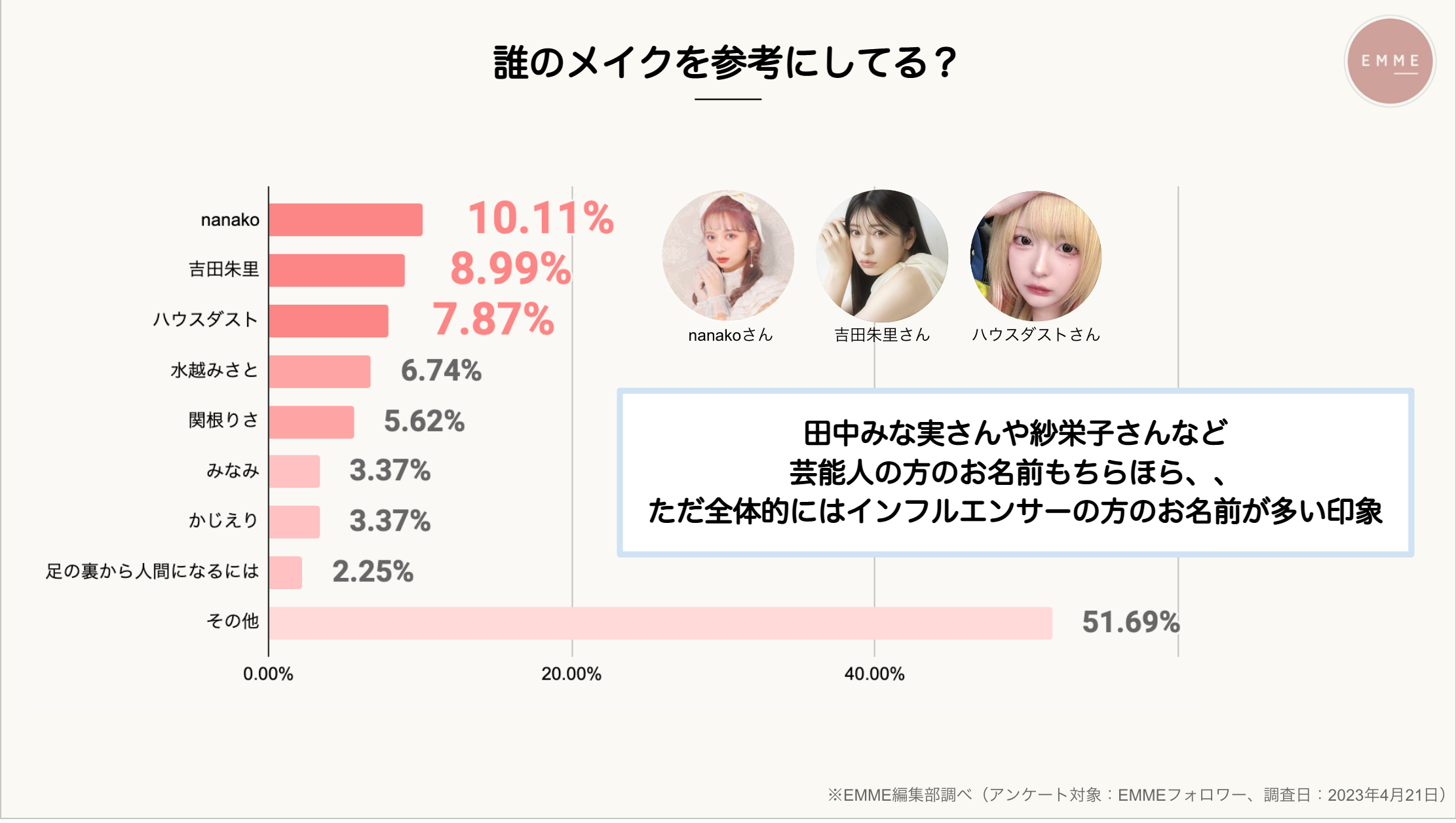 そんなメイクに化粧品に関心の高いEMMEのフォロワーが選ぶ「推し」の美容系インフルエンサーは?という質問に対しては、、