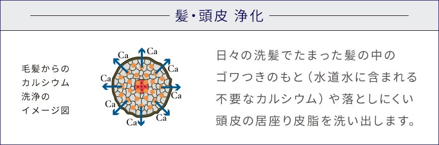 髪内部からゴワつきの原因となる不要なカルシウムを洗い流し、頭皮の皮脂汚れまで浄化。清らかで美しい髪へ。