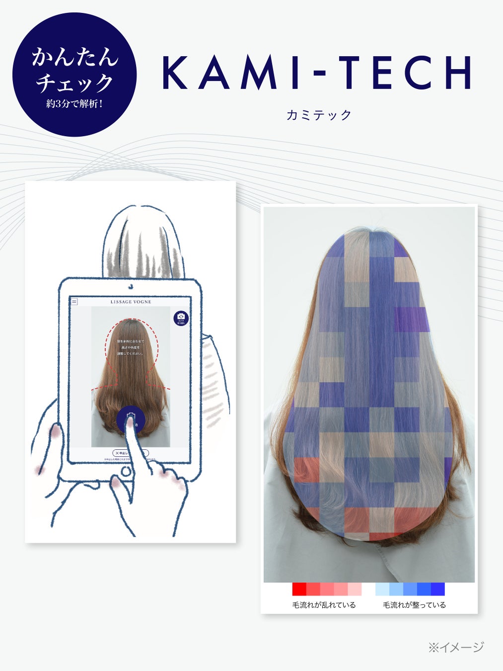 「リサージ」では、花王独自開発の AI 解析技術を搭載し、24通りの組み合わせから、しなやかな髪へ導くヘアカウンセリングツール「KAMI-TECH」を開発。今回のリニューアルに合わせて、主な取り扱い店に導入します。アンケートのあと、髪画像をAIで解析し、現在の髪の状態を短時間で簡単に測定。「頭皮タイプ」「髪質タイプ」、そして「しなやか美髪度(※3)」等の髪状態に着目したヘアカウンセリングを提供し、一人ひとりのお客さまにおすすめのアイテムを提案します。