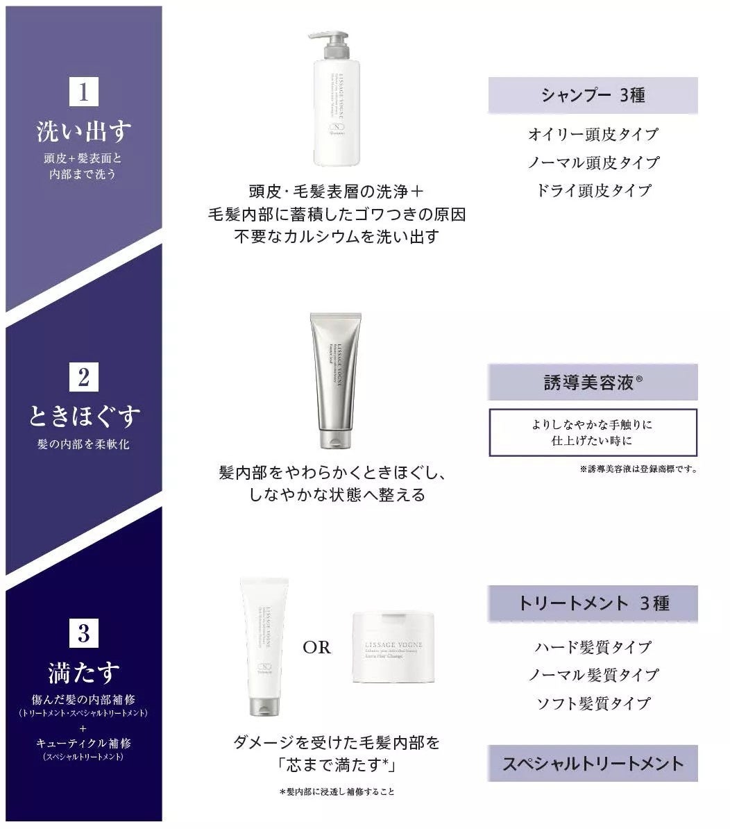 シャンプー3種(オイリー頭皮/ノーマル頭皮/ドライ頭皮タイプ)、誘導美容液(R)1種、トリートメント3種(ハード髪質/ノーマル髪質/ソフト髪質)、スペシャルトリートメント1種を組み合わせ、24通りのパーソナルケアを選ぶことができます。