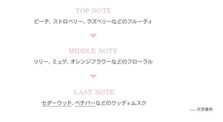 ピーチやストロベリーなど、甘酸っぱい香りがやわらかく広がり、リリーやミュゲ、オレンジフラワーのけがれのないピュアでクリーンな香りへと続く。温もりと深いリラックス感をもたらすセダーウッドやベチバーが、ラストノートまでエスコートします。